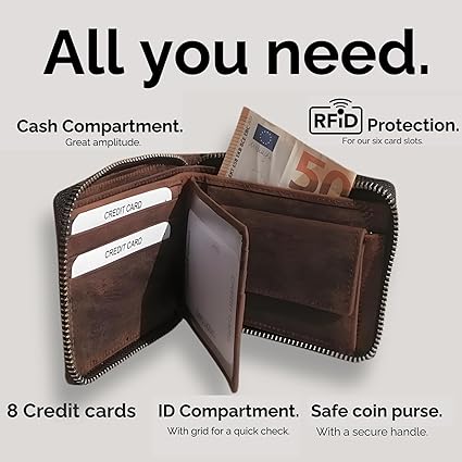 Cartera compacta y segura, fabricada en cuero genuino de alta calidad. Cuenta con protección RFID, cierre completo con cremallera, espacio para 8 tarjetas, compartimento doble para billetes y monedero con broche. Su diseño sobrio en marrón oscuro la convierte en una opción ideal para el uso diario con estilo. Medidas: 11 cm de ancho, 9 cm de alto y 2 cm de grosor.